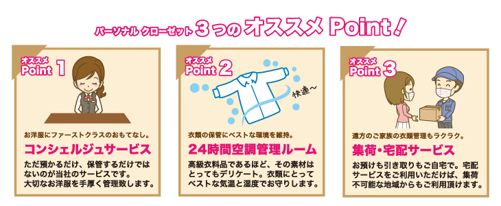 - 株式会社ローブ・ニシジマ社内にて、お客様専用の個別のお部屋をご用意してお洋服をお預かりするサービスです。